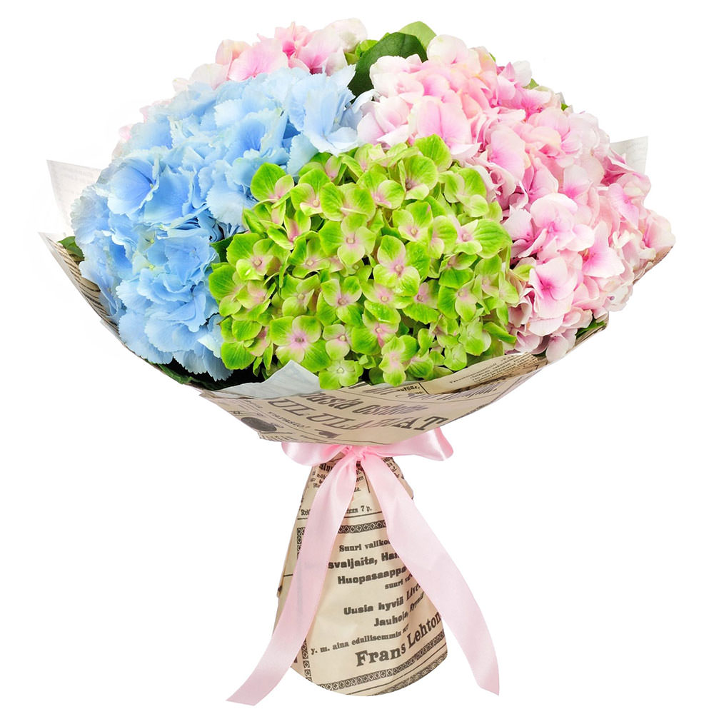 Гортензия микс (розовая, зеленая, голубая). Упаковка (лента, пленка, крафт, сетка, пленка матовая)