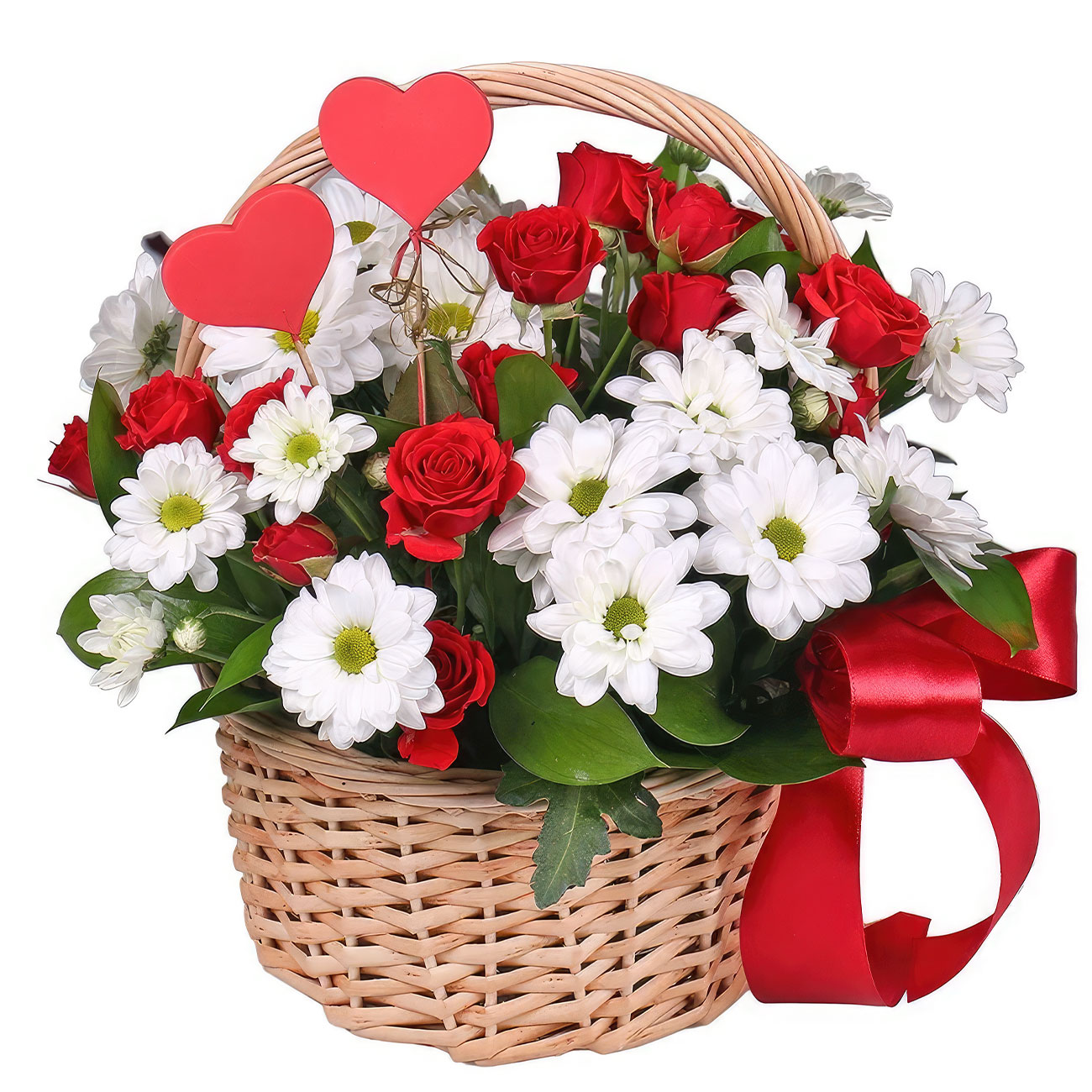 Хризантема кустовая белая, роза одноголовая красная. Упаковка (Корзина, оазис, ящик).
