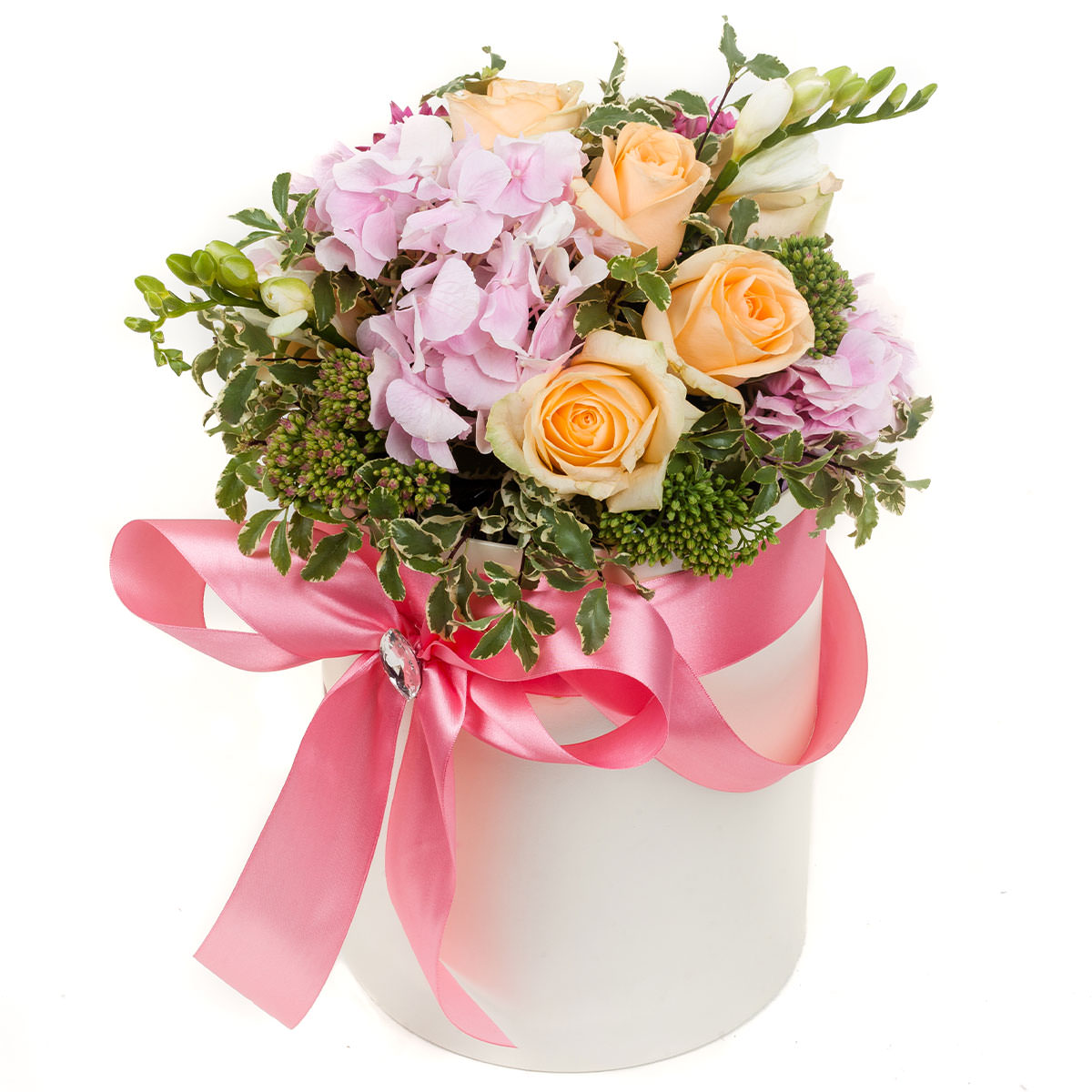 Гортензия розовая, роза одноголовая персиковая, фрезия белая, зелень. Упаковка (шляпная коробка, квадратный бокс, коробка сердце, оазис)