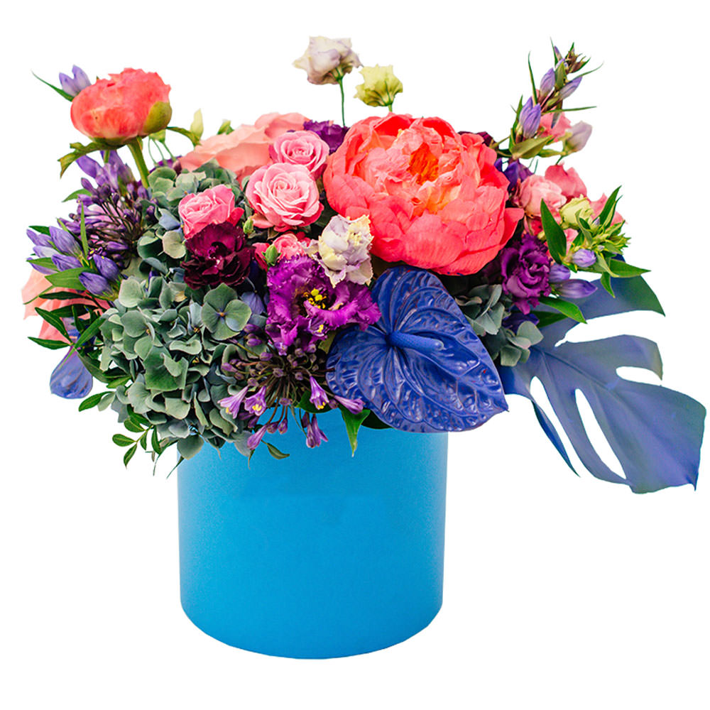 Антуриум, монстера крашенная, пион коралловый, роза одноголовая розовая, роза кустовая розовая, эустома фиолетовая, гортензия зеленая, гвоздика кустовая, аллиум, гентиана. Упаковка (шляпная коробка, квадратный бокс, коробка сердце, оазис)
