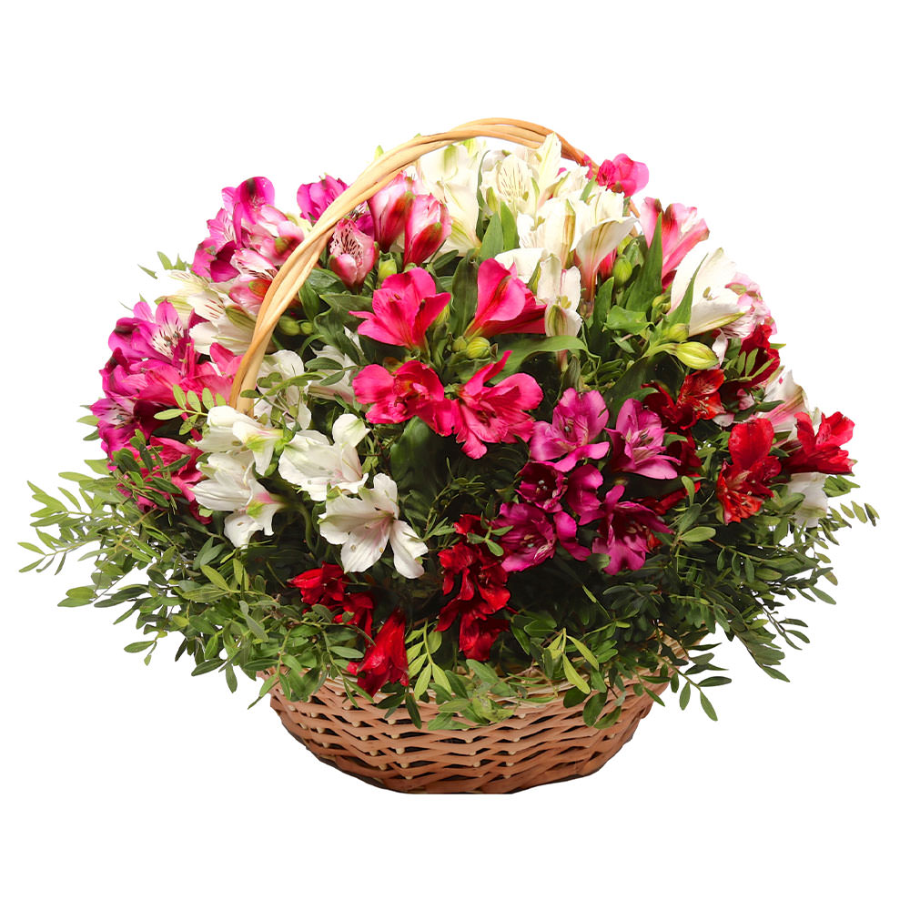 Альстромерия микс (белая, розовая, бордовая), фисташка. Упаковка (Корзина, оазис).